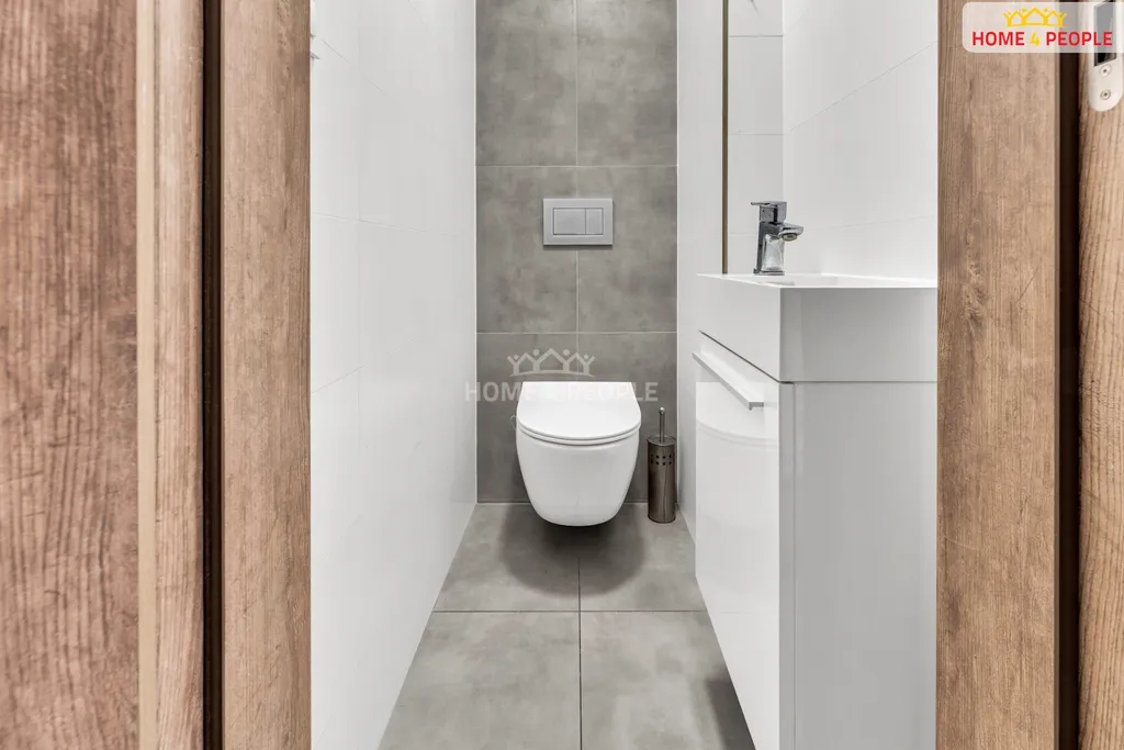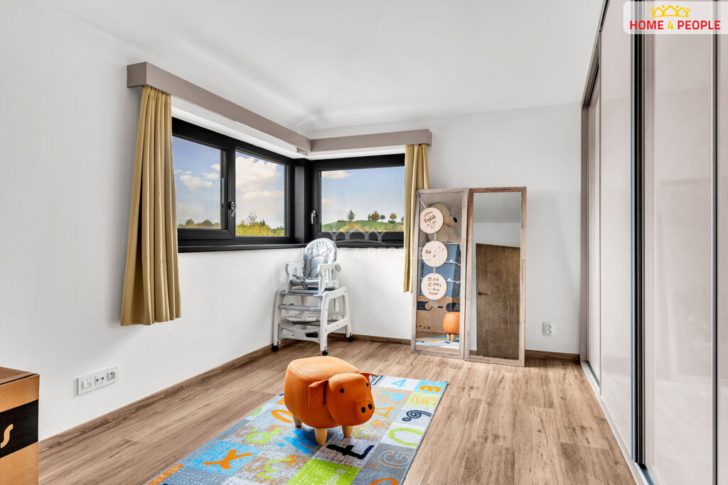 Jednotka je vytápěna úspornými uhlíkovými foliemi a zimní zahrada topnými kabely. V přízemí prostorná technická místnost, samostatné WC, velký obývací pokoj propojený se zahradou, moderní kuchyňský kout a praktický sklad pod schodištěm. Mramorové schodiště s designovým zábradlím. V 1. patře umístěna ložnice s vestavnými skříněmi pro uložení věcí a ve 2. patře jsou dva další pokoje - velká rodičovská ložnice a pokoj opět se skříněmi na míru s dostatkem úložného prostoru. Na společné chodbě samostatná toaleta a velká koupelna s vanou a sprchovým koutem. V oknech v přízemí a prvním patře venkovní žaluzie. Na podlaze je vinyl a mramor.