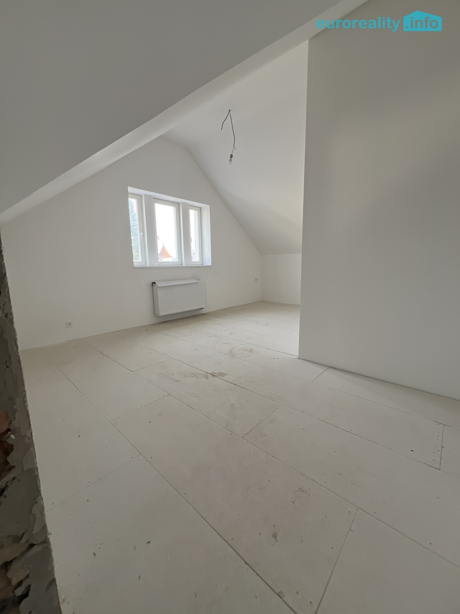 Tento podkrovní byt je umístěn ve 3. patře třípodlažního bytového domu. V bytě je nová koupelna, včetně zřizovacích předmětů, dlažby apod.. Nová vinylová podlaha, dřevěná okna, nové omítky, elektřina, rozvody vody, topení atd. U domu je společná zahrada a nabízíme také možnost k bytu přikoupit vlastní parkovací stání.
