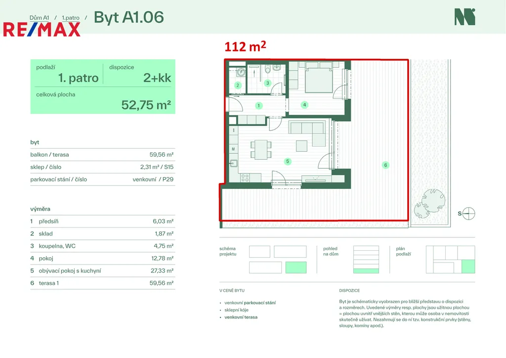 Nabízený byt A1.06 s plochou k užívání o výměře 112m2 se nachází ve zvýšeném přízemí domu A1. Užitná plocha samotného bytu je 55,51 m2 plus 59,56 m2 terasy plus 2,31 m2 sklep. Slunná a prostorná terasa je orientována jihozápadním směrem. Pochozí výška terasy asi 1 metr nad terénem plus zábradlí terasy s výškou zhruba 90cm zakončené truhlíkem pro pěstování zeleně Vám poskytne dostatek soukromí.