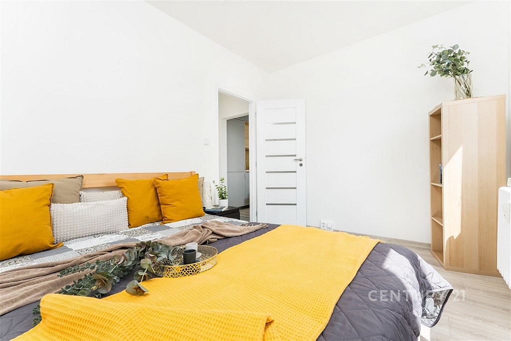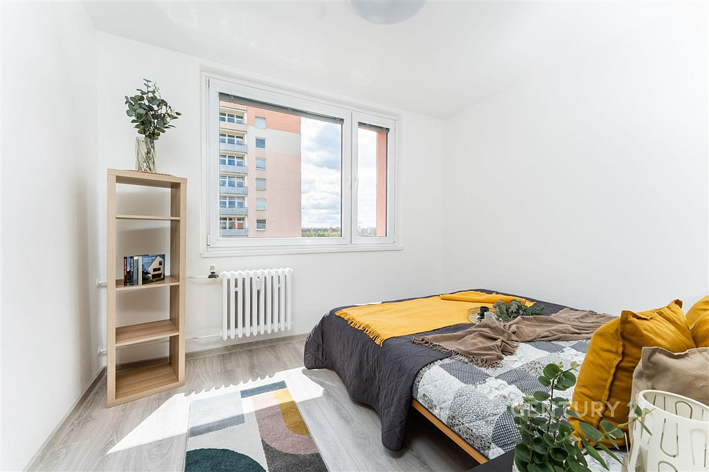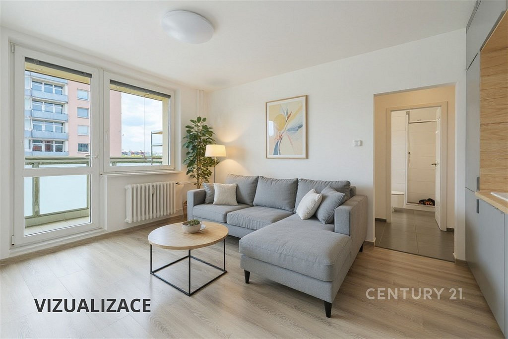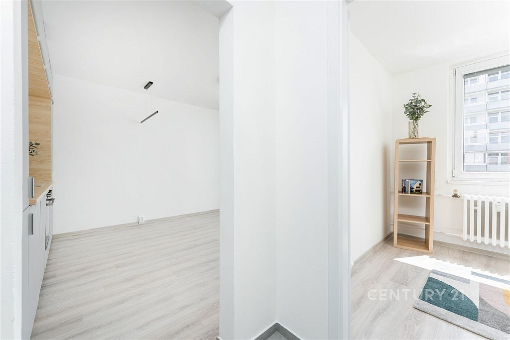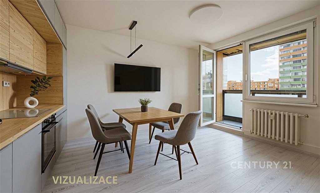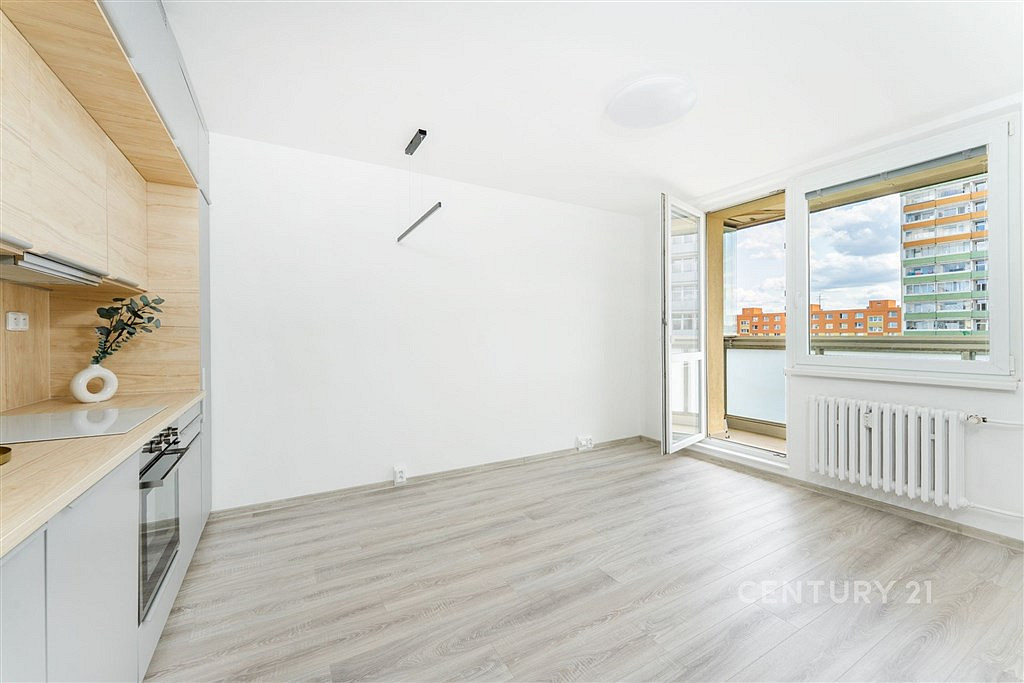 Srdcem bytu je obývací pokoj s výstupem na lodžii a s novou moderní kuchyňskou linkou, vybavenou vestavěnými spotřebiči a spoustou úložných prostorů.