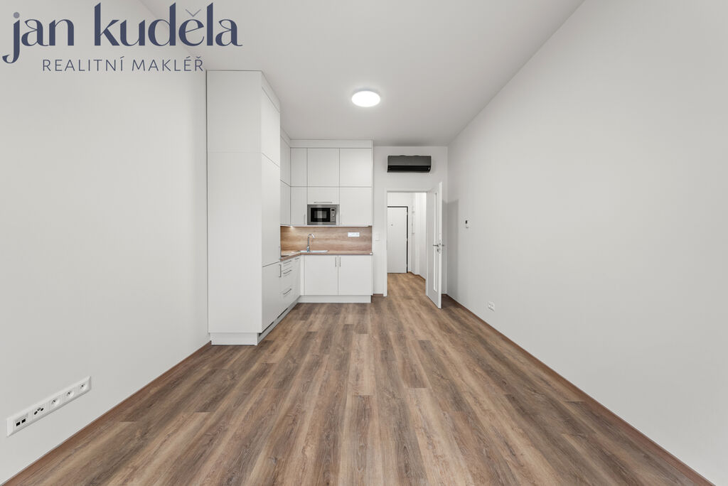 Nabízíme k pronájmu nový a světlý byt o dispozici 1+kk o celkové podlahové ploše 33,4 m2 včetně terasy 4,9 m2, umístěný v 5. nadzemním podlaží bytového domu Meridiem. K bytu náleží také prostorný sklep.
