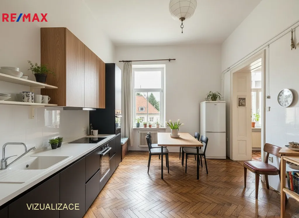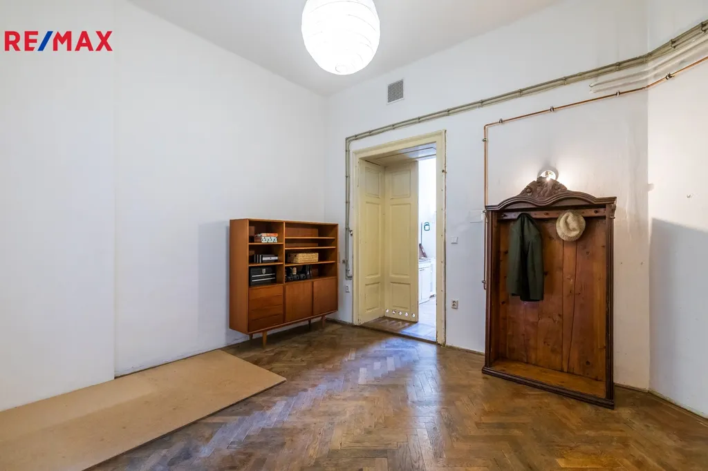 Vysoké stropy, velká okna, původní parkety i historické detaily, které dodávají bytu jedinečný charakter.