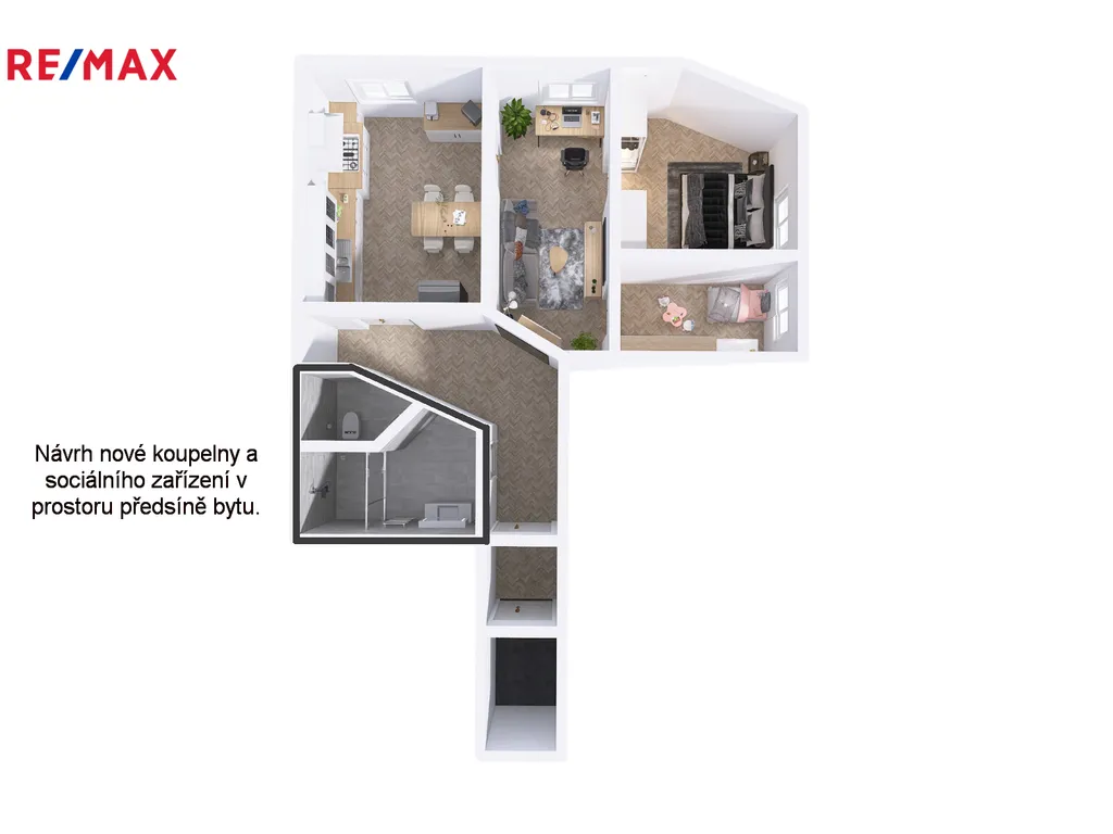Velkorysý prostor předsíně skýtá možnost vybudování nové koupelny a dalšího úložného zázemí. Architektonický návrh úprav byl již schválen stavebním úřadem, což výrazně usnadňuje realizaci budoucí modernizace dle vlastních představ