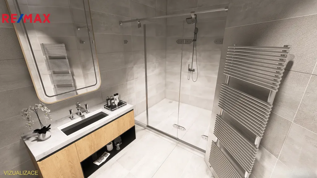 Koupelna o velikosti 6 m² je situována přes společnou chodbu – nabízí se tak možnost jejího funkčního přetvoření například na prostornou prádelnu s dostatkem úložného prostoru.