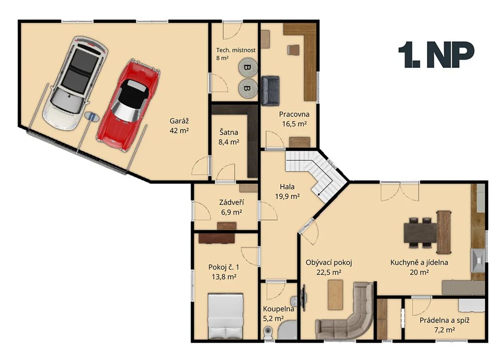 Z centrální haly se dostanete do pracovny, pokoje č.1, koupelny a také do obývacího pokoje s kuchyňským koutem, který tvoří srdce celého domu.