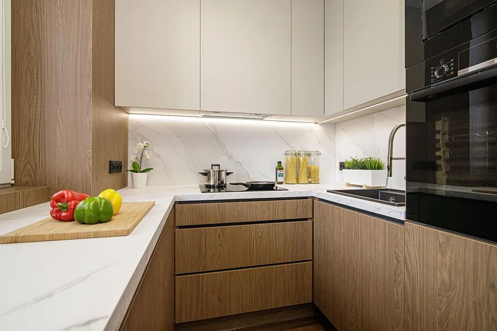 - Kuchyňská linka na míru včetně vestavných spotřebičů: lednice, myčka, digestoř, elektrická trouba, mikrovlná trouba, indukční varná deska, LED podsvícení