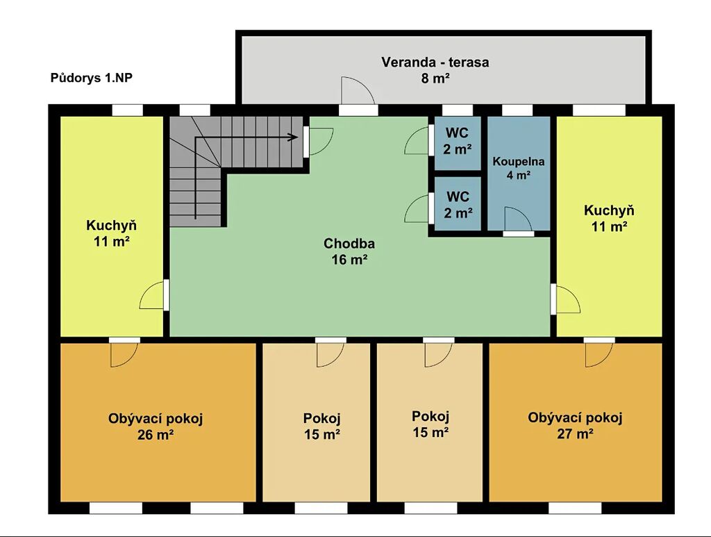 V přízemí se nacházejí dvě plně samostatné bytové jednotky, každá s vlastní kuchyní, koupelnou a obývacím pokojem.