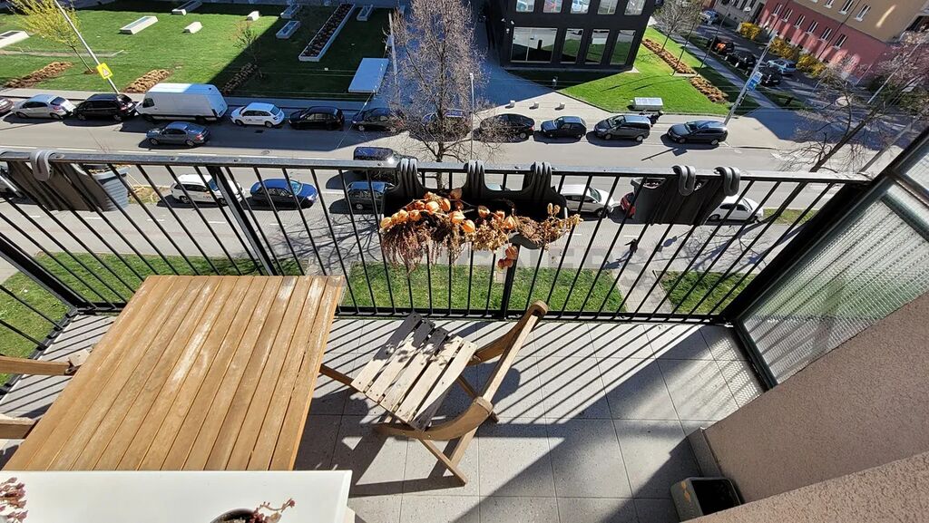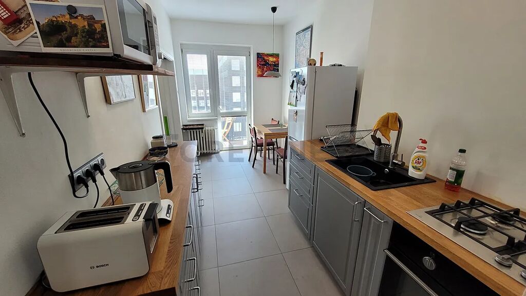 - Kuchyň vybavená sporákem, troubou, mikrovlnkou, lednicí, jídelním stolem, židlemi a vstupem na balkon