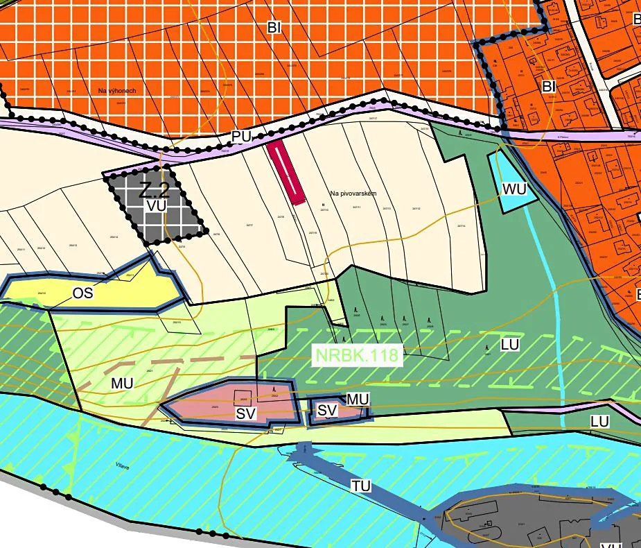 Pozemky na pravé straně příjezdové komunikace jsou v územním plánu vedené jako plocha určená pro výstavbu rodinných domů. Změna územního plánu aktuálně není projednávána, nelze ji tedy garantovat, ale do budoucna ji nelze vyloučit.