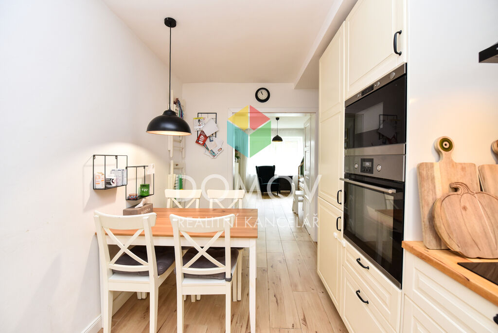 Dispozice zahrnuje prostornou kuchyň vybavenou kuchyňskou linkou s indukční varnou deskou, vestavěnou lednicí s mrazákem, myčkou, elektrickou troubou, mikrovlnnou troubou, digestoří a dřezem.