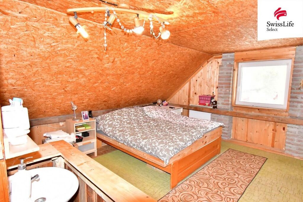 Dřevěné schodiště vás zavede do podkroví domu, kde se vchází do všech pokojů. Z ložnice je přímý přístup na balkón. Patro dále nabízí dva pokoje a toaletu.