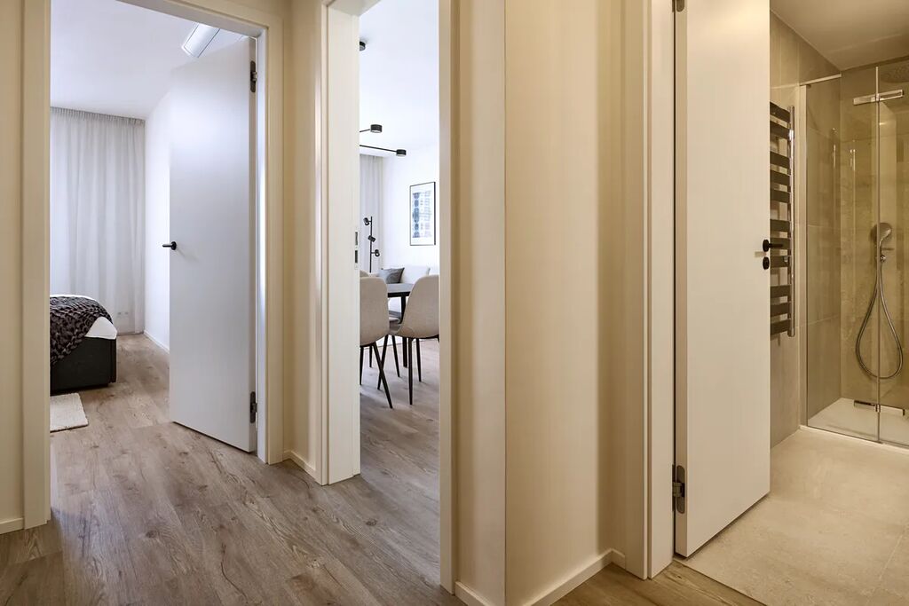 Je vybaven podlahovým vytápěním, centrální rekuperací a inteligentním systémem LOXONE, který umožňuje ovládání osvětlení, vytápění, žaluzií či ventilace pomocí tabletu v bytě nebo přes aplikaci v telefonu. Součástí vybavení jsou elektricky ovládané venkovní žaluzie.