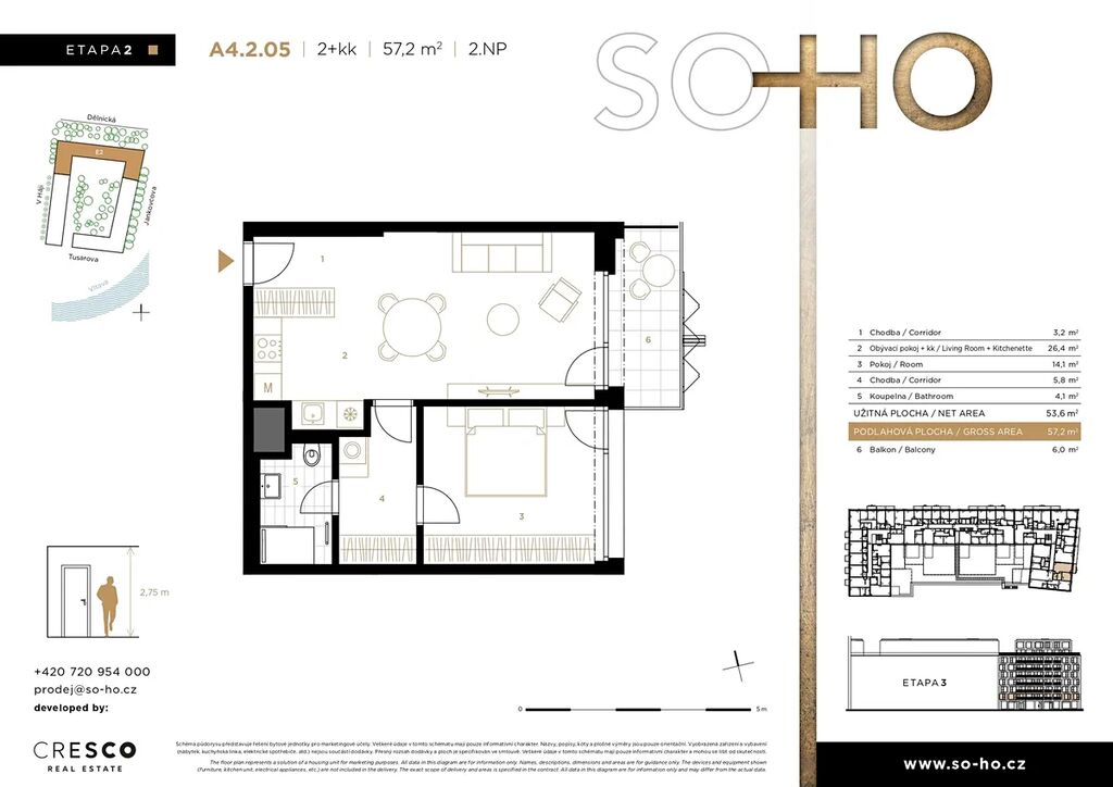 Světlý byt 2+kk (57,2 m²) s balkonem (6 m²) se nachází ve 2. nadzemním podlaží moderní novostavby 2. etapy SO-HO Rezidence, v atraktivní lokalitě jižních Holešovic. Dispozičně promyšlený byt nabízí prostorný obývací pokoj s přímým vstupem na balkon, který je propojen s kuchyní a jídelní částí, což vytváří ideální zónu pro relaxaci i setkávání s přáteli. Ložnice nabízí dostatek místa pro velkou postel i úložné řešení. Vstupní hala a praktická průchozí šatna poskytují dostatek úložného prostoru.