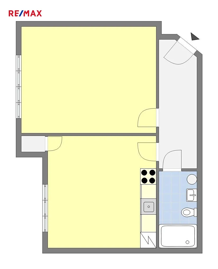 Dispozice bytu - obývací pokoj s prakticky zařízenou kuchyňskou linkou vybavenou spotřebiči, ložnice, malá komora a koupelna se sprchovým koutem a toaletou. V koupelně je k dispozici pračka.