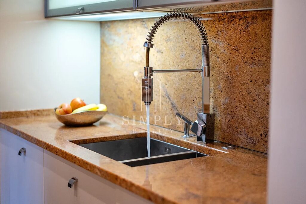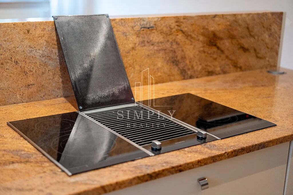 Dominantou bytu je prostorný obývací pokoj s moderní kuchyní, která nabízí praktický ostrůvek, vestavné spotřebiče, dostatek úložného prostoru a navíc je vybavena zabudovaným grilem a drtičem odpadu.