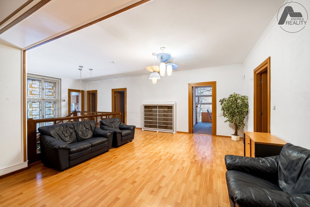 Jádro domu tvoří jednopatrová schodišťová hala anglického typu, s bohatě členěnými dřevěnými stěnami a stropem zdobeným uměleckým dekorem ve stylu art deco. Vila má celkem 4 podlaží s podlahovou plochou 686m2, prostorné nádvoří s 12 parkovacími místy, ideálními pro vaše obchodní partnery nebo klienty. Zastavěná plocha a nádvoří má rozlohu 286m2, parkovací plocha 920 m2.