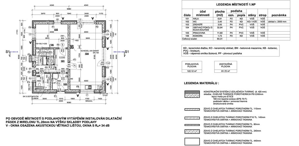 Nabízený rodinný dům je určen pro pohodlný život 4-5 členné rodiny. Dispozice 5+1 nabízí užitnou plochu 122 m². Bohatý vnitřní prostor zahrnuje v přízemí obývací pokoj spojený s kuchyňským koutem, dále pokoj pro hosty nebo pracovnu, zádveří, předsíň, koupelnou se sprchovým koutem a WC, komoru. Po pohodlném dvouramenném betonovém schodišti vystoupáte do 2. patra, kde se nachází ložnice a 2 dětské pokoje, samostatná koupelna s rohovou vanou a WC. Z části galerie může být např. šatna. Standardně je dům vybaven tepelným čerpadlem s podlahovým vytápěním, krbovým komínem, závěsnými WC, rohovou vanou, hromosvodem a podlahovými krytinami ve variantě vinylu nebo keramické dlažby.