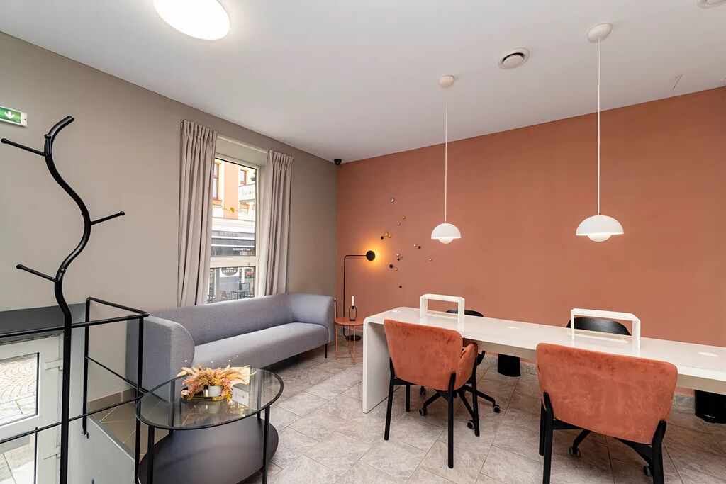 hlavní místnost s pracovním stolem a klientskou zónou,