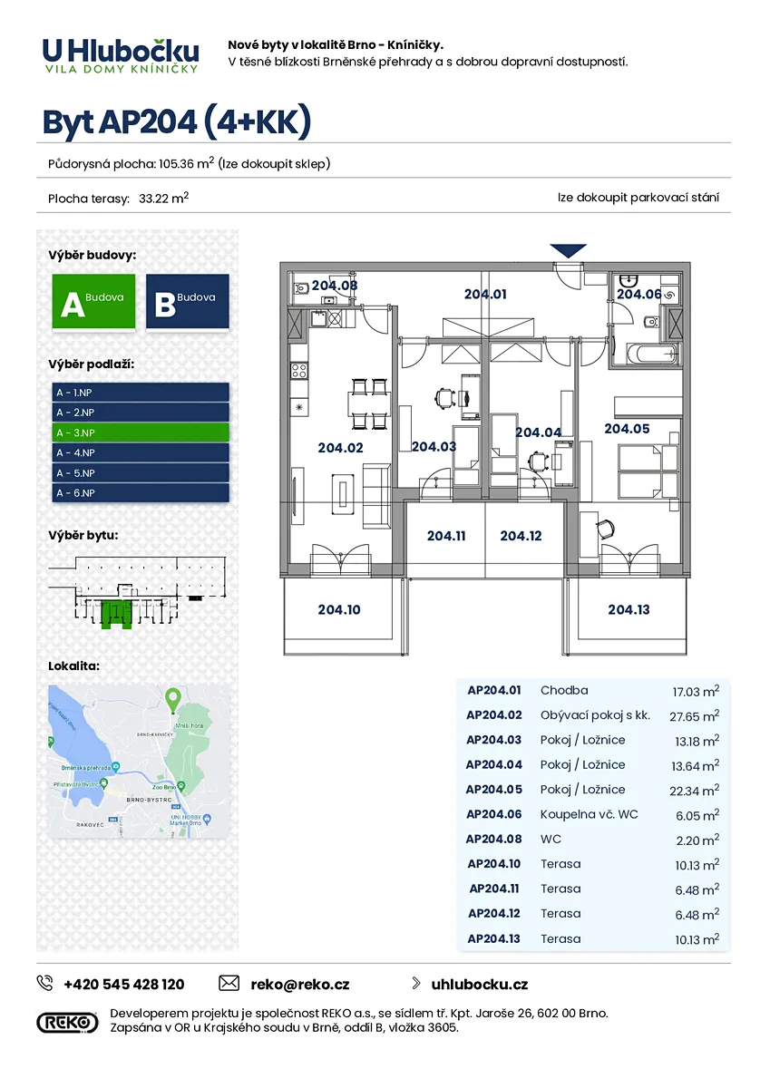 Nabízíme k prodeji byt o velikosti 4+kk (105,36 m2) s terasou o vel. 33,22 m2 a sklepem v lokalitě Brno - Kníničky. Byt se nachází v 3.NP s výhledem do zeleně (Mniší hora) v "U Hlubočku" - dům A - k nastěhování tento říjen. V kupní ceně bytu je zahrnuto parkovací stání v domě. Orientace bytu je východ.