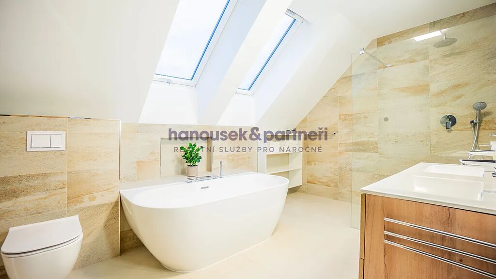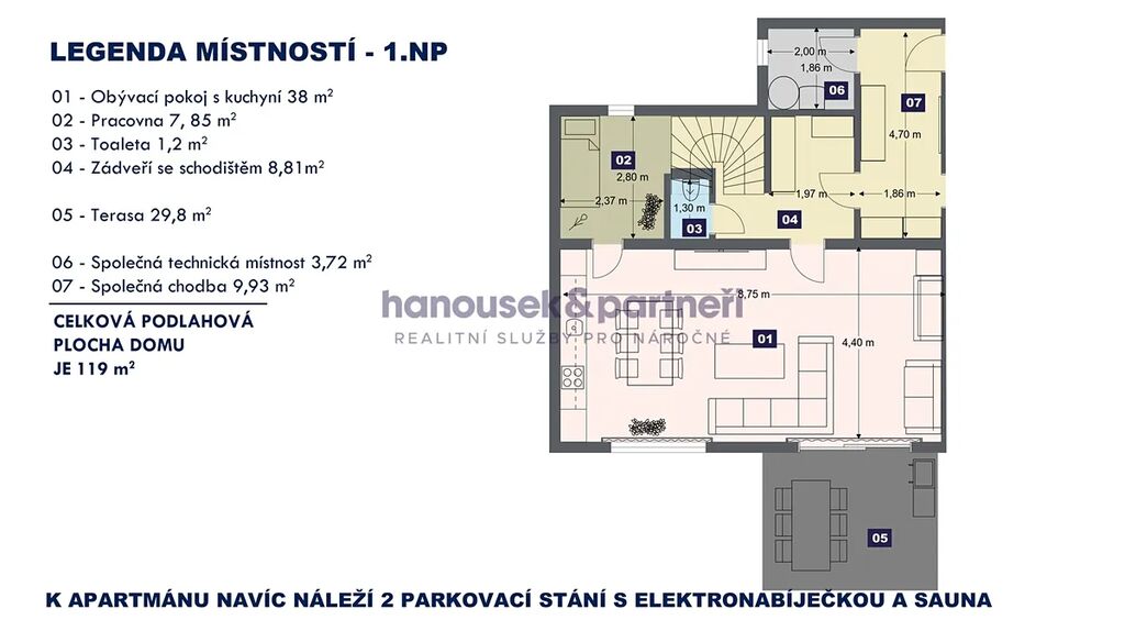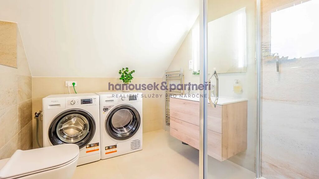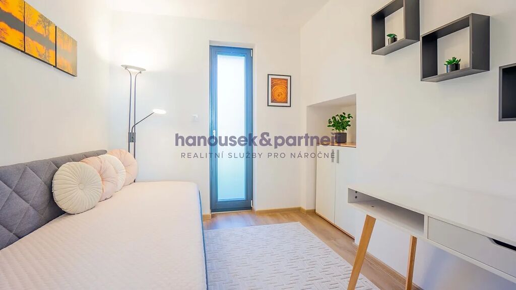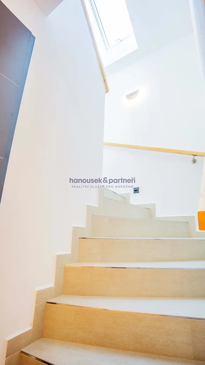 Apartmán je jedním ze dvou bytů v cihlové rodinné novostavbě. Má dispozici 3+kk a celkovou výměru 119 m2. V přízemí je obývací pokoj s kuchyní a vstupem na terasu, pracovna a samostatné WC. V patře jsou dvě ložnice a dvě koupelny.