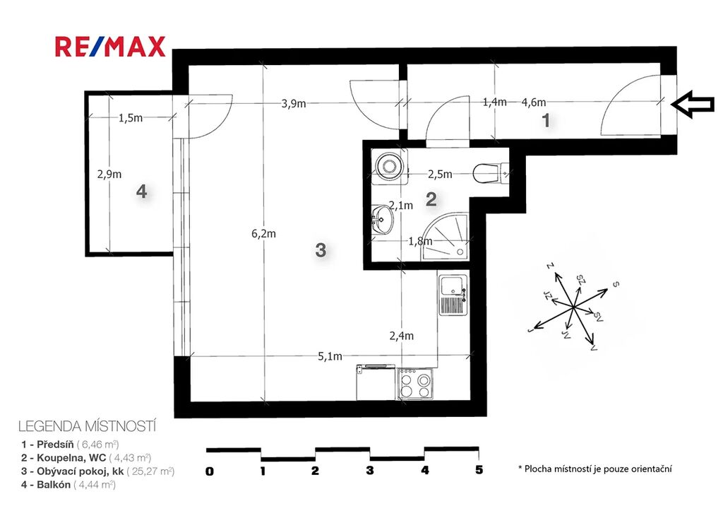 Byt 1+kk s balkonem, komorou (celkově 43 m²) a prostorným garážovým stáním.