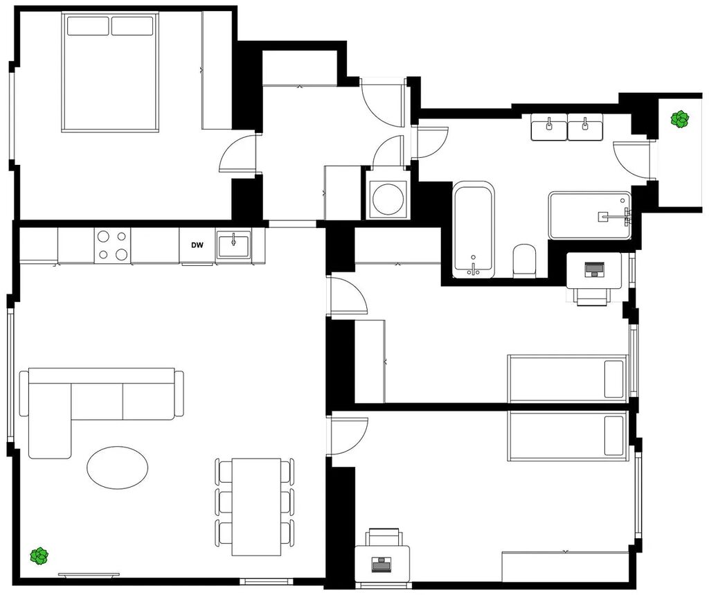 Dispozice bytu nabízí prostorný obývací pokoj s kuchyňským koutem a tři samostatné pokoje vhodné jako ložnice, dětské pokoje nebo pracovna. Koupelna je vybavena vanou, sprchovým koutem, dvojumyvadlem a toaletou, a je z ní také vstup na balkon o velikosti 1,3 m². Součástí bytu je sklepní kóje o velikosti 8,25 m² v suterénu domu.