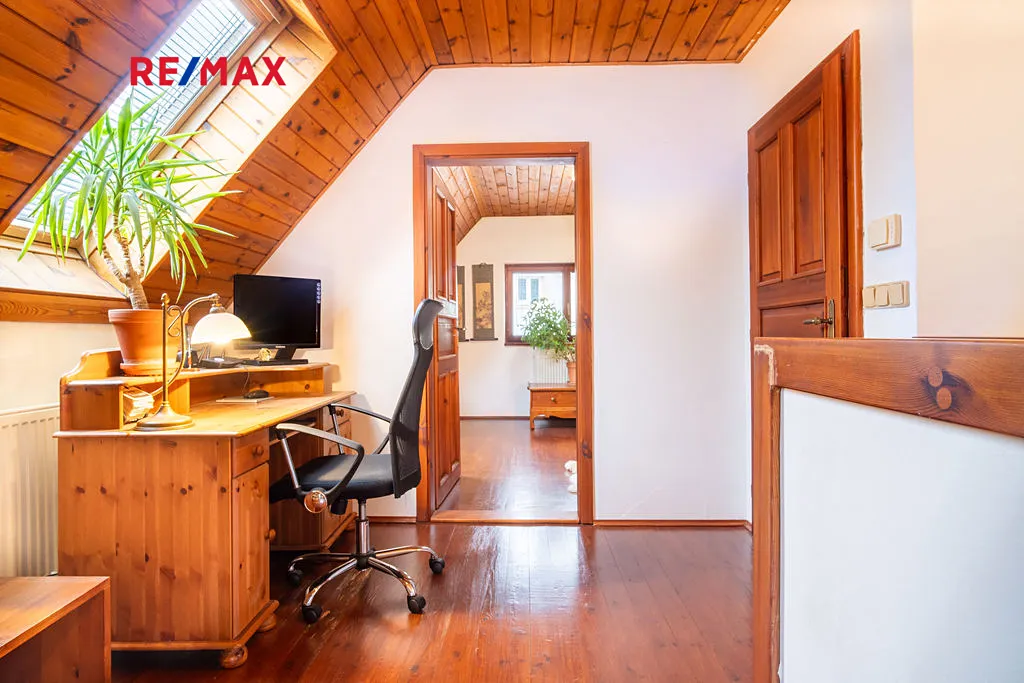 Do prvního patra vedou točité schody z kuchyňské části. Najdete zde dvě útulné podkrovní ložnice (jedna s vlastní šatnou), pracovní kout a další samostatné WC. Z jedné ložnice je vstup na terasu s panoramatickým výhledem do krajiny.