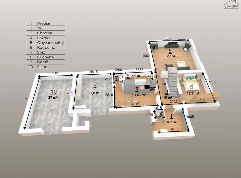 Přízemí (1. NP) prošlo kompletní a pečlivou rekonstrukcí, zatímco 2. NP zůstalo v původním stavu – připravené pro nové nápady, které můžete realizovat na ploše 98 m² půdy, jak vidíte i na 3D plánku.