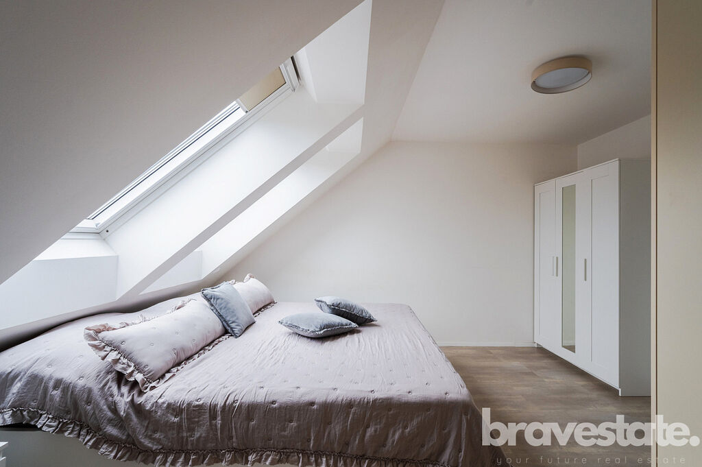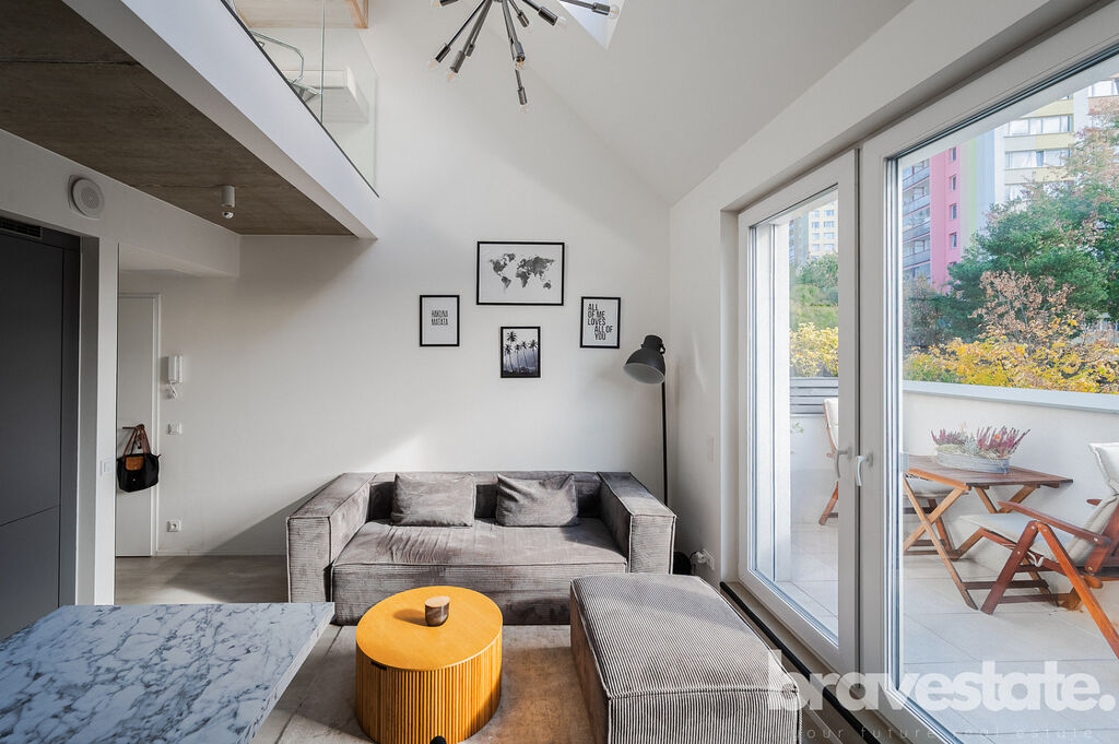 V bytě se nachází prostorná předsíň, dětský pokoj/pokoj s balkónem. Koupelna se sprchovým walk-in koutem a umyvadlem. Obývací pokoj s kuchyní s výškou stropu 6 metrů. Z obývacího pokoje je vstup na terasu a schody do druhého plnohodnotného patra bytu. V druhém patře se nachází hlavní ložnice, toaleta a prostorná galerie s pracovnou.