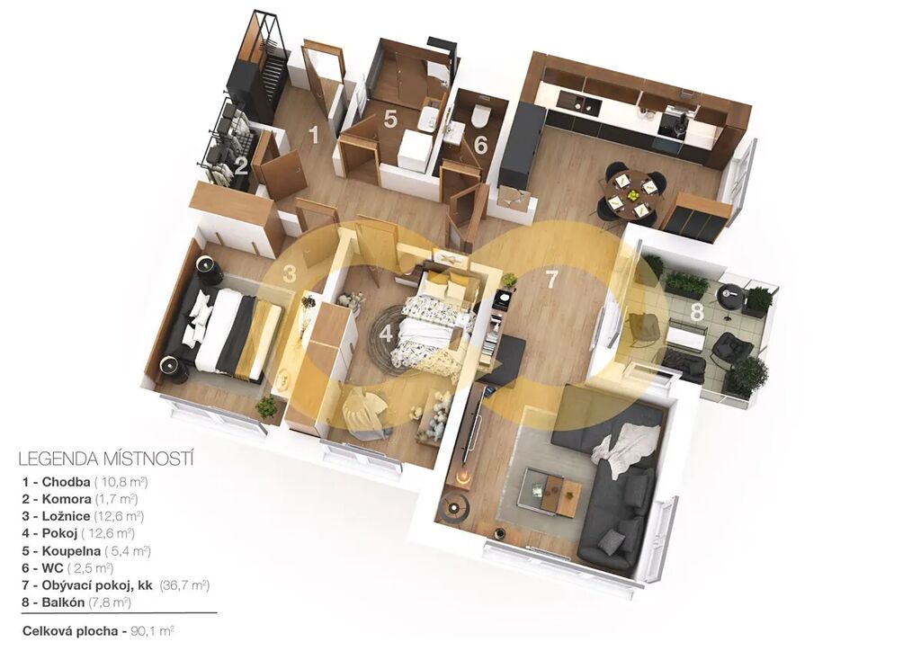 Byt má dispozici 3+kk a výměru 86 m². Skládá se z obývacího pokoje s kuchyní, dvou pokojů, koupelny, samostatného WC a vstupní chodby. K bytu patří balkon o velikosti 9 m², sklep a parkovací stání ve společné garáži.
