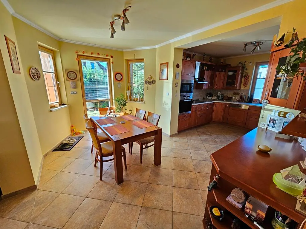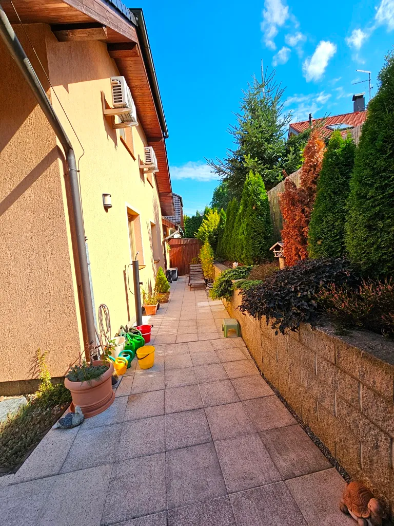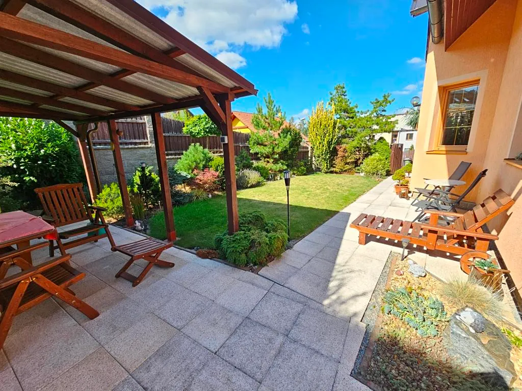 Ve výhradním zastoupení nabízíme k prodeji patrový zděný RD s garáží o zastavěné ploše 125 m2 a dispozici 5 +kk o celkové užitné ploše 160 m2 + 20m2 garáž. K relaxaci je určena upravená zahrádka o výměře cca 200m2 orientována na jihozápad (poskytuje možnost celodenního slunění), kde je k dispozici pergola se zahradním nábytkem, sezení u domu a sklad zahradního nábytku. Zahrádka není náročná na údržbu díky své velikosti a přesto poskytuje soukromí lepší než mnohé rozlehlé zahrady ve srovnatelných lokalitách. Vjezd ke garáži a vlastnímu parkovacímu stání před garáží je zajištěn věcným břemenem přes společný příjezd k sousednímu domu, se kterým prodávaný RD sousedí jen garáží a parkovacím stáním.