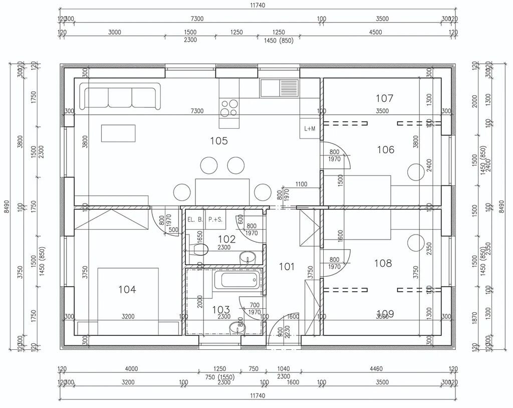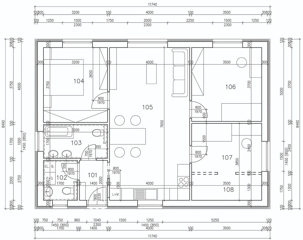 • Dispozice 4+kk: Přízemní dům s třemi samostatnými pokoji, prostorným obývacím pokojem spojeným s kuchyní, koupelnou, WC, technickou místností a přímým vstupem na terasu.