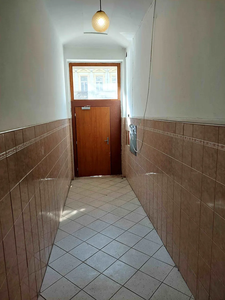 Byt se nachází v přízemí ve staré budově. Na chodbě je kuchyňský kout, koupelna se sprchovým koutem a záchod je odděleně. Z chodby se vchází do první místnosti a z ní do další.