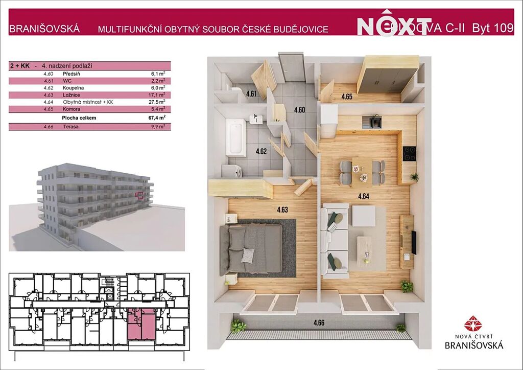 Představujeme vám elegantní byt č. 109 2+kk o užitné ploše 67,4 m² s prostornou terasou 9,9 m², umístěný ve čtvrtém nadzemním podlaží (tedy ve třetím patře) nového rezidenčního projektu na Branišovské ulici v Českých Budějovicích. Byt je orientován na západ do klidného vnitrobloku, což mu dodává dostatek světla a současně zaručuje naprosté soukromí.