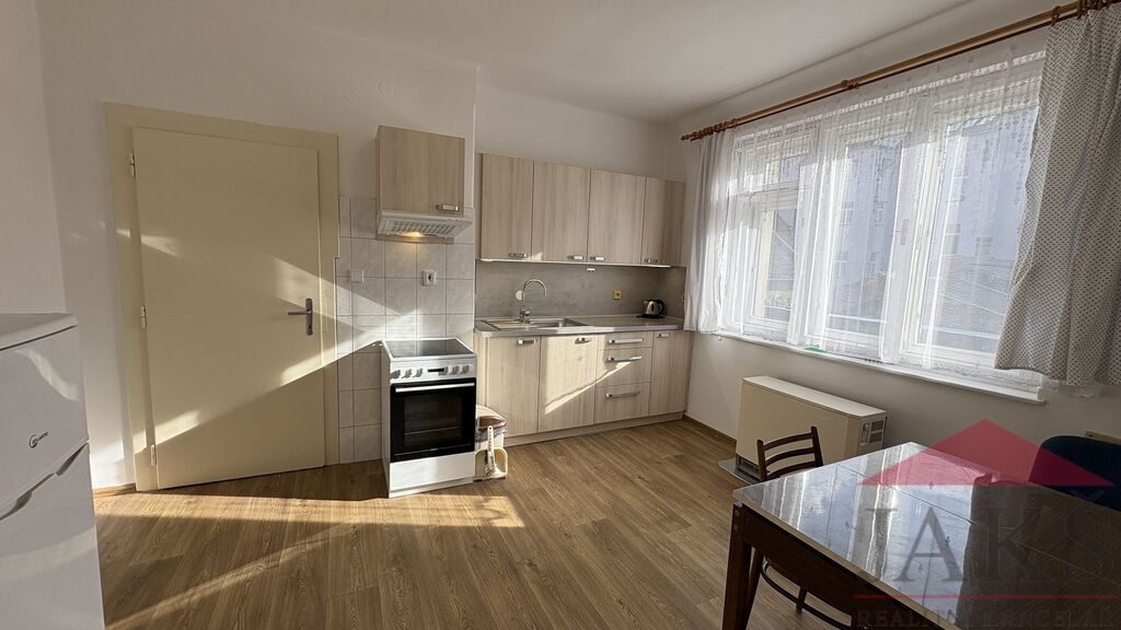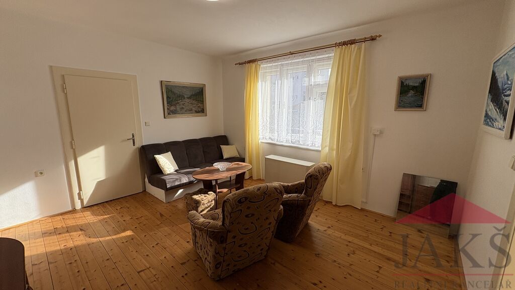 Popis: přístup skrze průjezd, schodiště do 2.NP: byt 3+1/B: předsíň, samostatné WC, koupelna (sprchový kout, vana, umyv. se zrcadlem, vývody na pračku) s oknem, průchozí kuchyň (kuch. linka s HV troubou se sklo-ker. deskou, digestoř, lednice s mrazákem) s jídelnou, průchozí obývací pokoj (sedací souprava, 2x křeslo, konferenční stůl, obývací stěna, komoda), hlavní ložnice (manželská postel se skříňkami) se vstupem na balkon a ložnice (palanda a šatní skříně). K bytu náleží sklad (el. boiler) v přízemí domu.