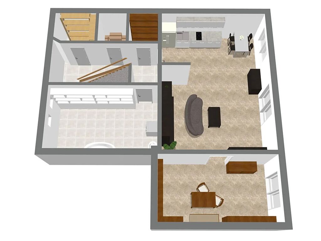 2. podlaží: byt o jednu místnost větší, rovněž s vlastní kuchyní, koupelnou a WC.