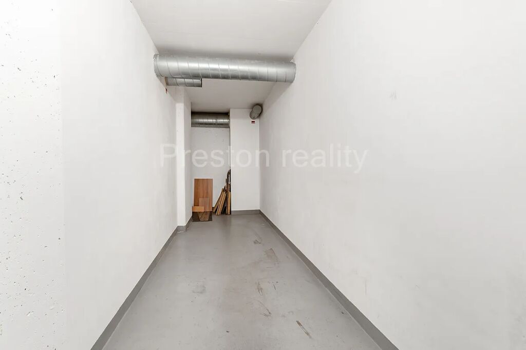 Bytu dominuje hlavní obývací pokoj s kuchyňským koutem (30 m2). Moderní kuchyňská linka je plně vybavena (elektrická trouba, mikrovlnná trouba, sklokeramická varná deska, lednice mrazák). Z obývacího pokoje je vstup na větší balkón (3,5 m2). V další části bytu se nachází dva samostatné pokoje (11 a 12 m2), přičemž jeden z nich má vlastní menší balkón (2 m2). V prostorné koupelně (5 m2) s rohovou vanou je prostor pro umístění standardně velké pračky (šíře 60 cm). WC zvlášť. K dispozici je také praktická komora v bytě (2,3 m2) a velký sklep u garážového stání ve třetím podzemním podlaží. Garáž o ploše 19 m2 má rozměry 2,87 x 6,67 m, přičemž vjezd je vrata umožňují vjezd pro vozidla o maximální šířce 2,24 m a výšce 1,94 m. Velkokapacitní sklep má plochu 10 m2 a rozměry 5,6 x 1,7 m. Pár kroků od vstupních dveří od domu je k dispozici praktická kočárkárna.