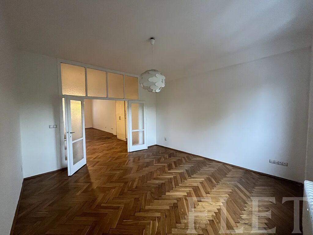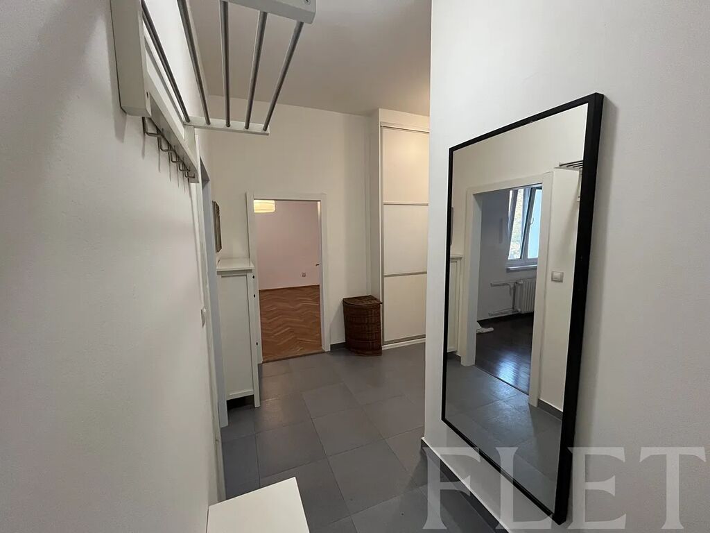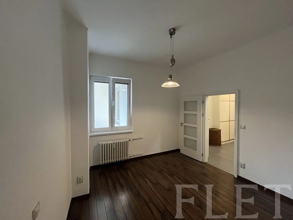 V bytě vás uvítá předsíň, ze které se dostanete do jednoho z menších pokojů, který můžete využít jako ložnici, dětský pokoj či pracovnu, do koupelny s vanou a na toaletu, která je samostatně. Dále vstoupíte do hlavní místnosti, která vás oslní svým prostorem, je zde dostatek místa pro obytnou i jídelní část s kuchyňským koutem, který je laděný do dobového stylu a je vybaven elektrickou i troubou, varnou deskou a vestavěnou lednicí s mrazákem. Na tuto místnost navazuje další pokoj oddělený prosklenými dvoukřídlými dveřmi. Z hlavní místnosti se také dostanete na velkou lodžii s výhledem do klidného vnitrobloku.