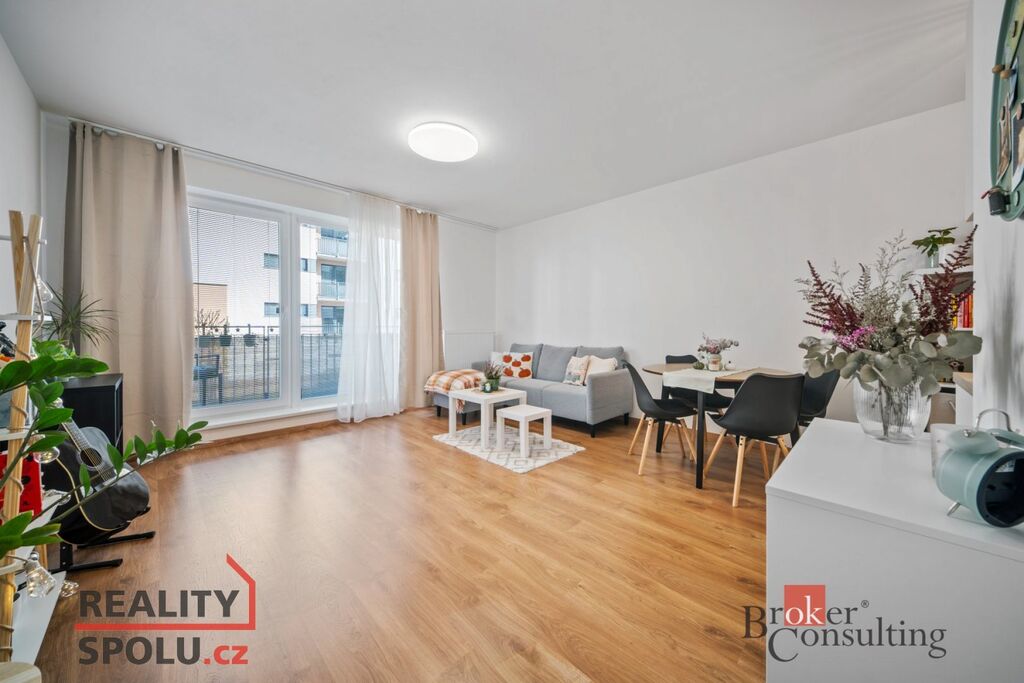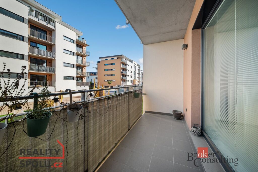 Byt o celkové podlahové ploše 58 m² nabízí dispozici vstupní chodby, obývací pokoj s kuchyňským koutem, jeden samostatný pokoj, koupelna s vanou, samostatné WC a komora. K bytu náleží balkony o velikosti 5,16 m² - přístupný jak z obývacího pokoje i ložnice. Součástí prodeje je také sklepní kóje s výměrou 2,13 m² a garážové parkovací stání 21 m².