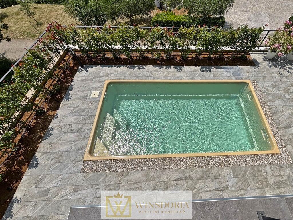 K dispozici je bazén s opalovací zónou, krytá terasa s grilem a velký jídelní stůl pro venkovní posezení.