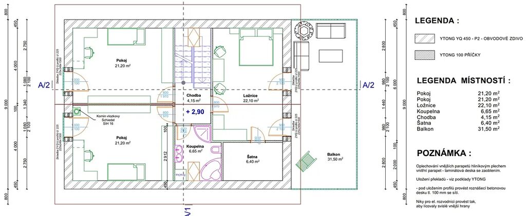 Dům je zděný z tvárnic Porfix premium s další vnější izolací 15 cm a střešní krytina je z betonových tašek. Okna jsou plastová 5ti komorová s trojskly a mají vnitřní barvu bílou a vnější s fólií v barvě dřeva. Vstupní dveře i sekční garážová vrata jsou také z plastu v barvě dřeva. V celém domě je elektrické podlahové vytápění s možností připojit navíc radiátory napojené jak na elektrokotel tak na krbovou vložku s výměníkem umístěnou v obývacím pokoji. Stropy jsou ze sádrokartonu a ložnice v podkroví mají dřevěnými palubkami obložené šikmé plochy. Podlahy jsou plovoucí s dekorem dřeva, v koupelnách je kvalitní a stylová dlažba a sanita. Vnitřní dveře jsou obložkové s dekorem světlého dřeva. Dům má hotovou vnější hrubou fasádu a k jejímu dokončení si stačí vybrat finální fasádní omítku. Na terasách je položená dlažba a vnitřní i vnější zábradlí je z nerezu.