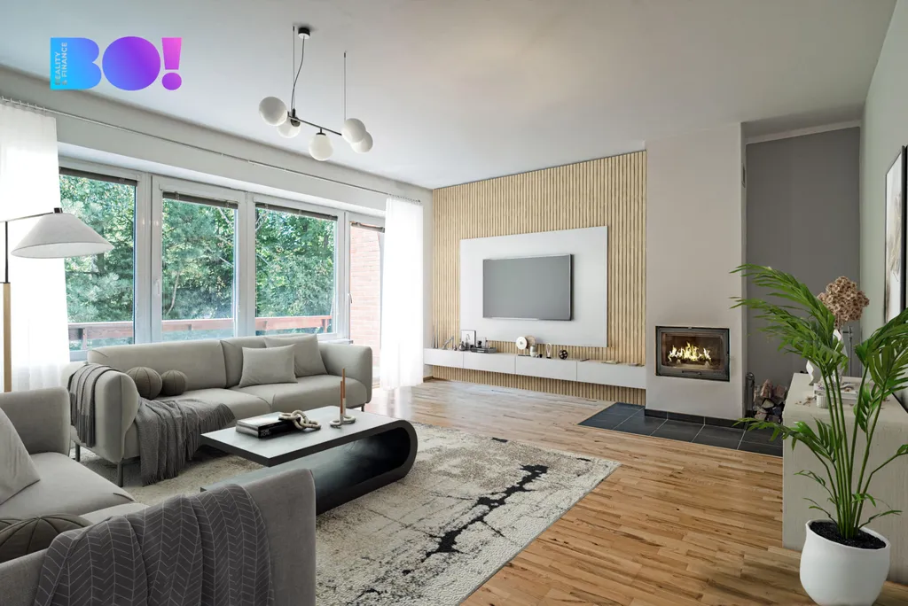 • 2. NP (společenská část): Prostorný obývací pokoj s krbem a vstupem na balkón,