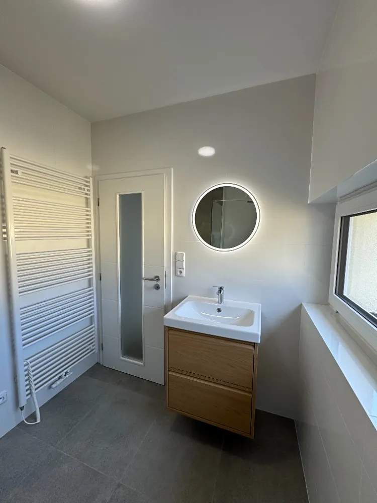 Koupelna je vybavená sprchovým koutem, umyvadlem se skříňkou, zrcadlem a WC.