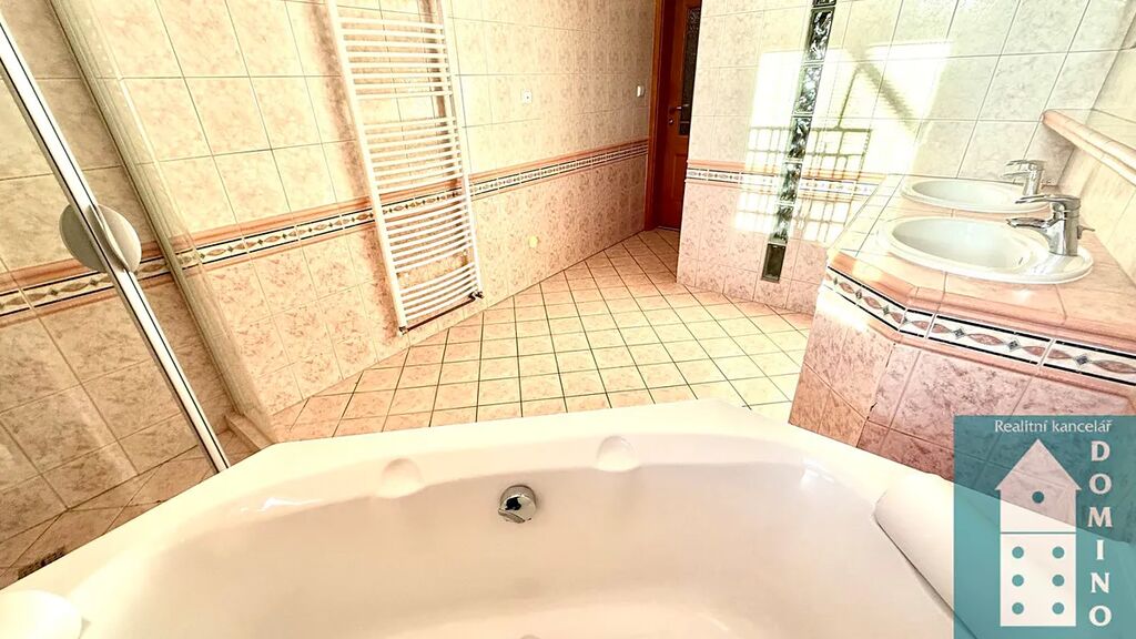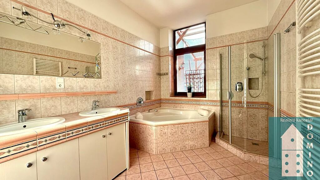 - prostorná koupelna s rohovou  vanou, sprchovým koutem a dvěma umyvadly