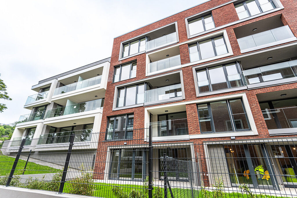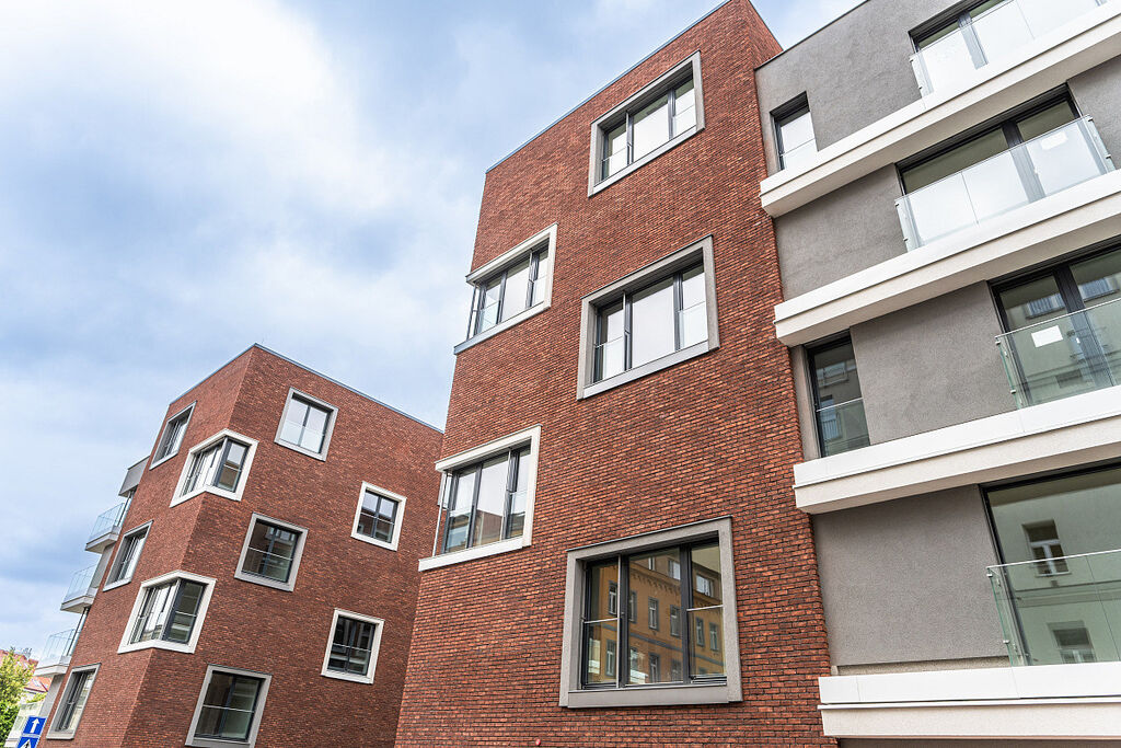 Originálně architektonicky řešené domy mají dřevěná eurookna a skleněná zábradlí na balkonech. Fasáda domu s luxusními cihelnými pásky podtrhuje jedinečnost tohoto projektu.