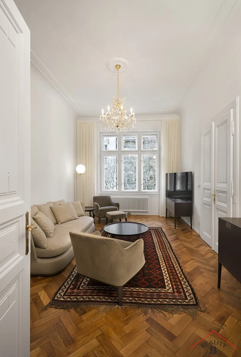 V bytě jsou parketové podlahy, štukové stropy a křišťálové lustry.