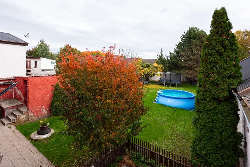 Součástí nemovitosti je garáž pro dvě auta a dvě venkovní parkovací stání. Na střeše garáže je vybudovaná terasa přístupná jak ze zahrady, tak z horní bytové jednotky. Zahrada za domem je komorní, oplocená zdí, která poskytuje příjemné soukromí. Kromě travnaté plochy a zeleně zde najdete zděný zahradní domek a dřevěné posezení ideální pro odpočinek nebo setkávání s přáteli.