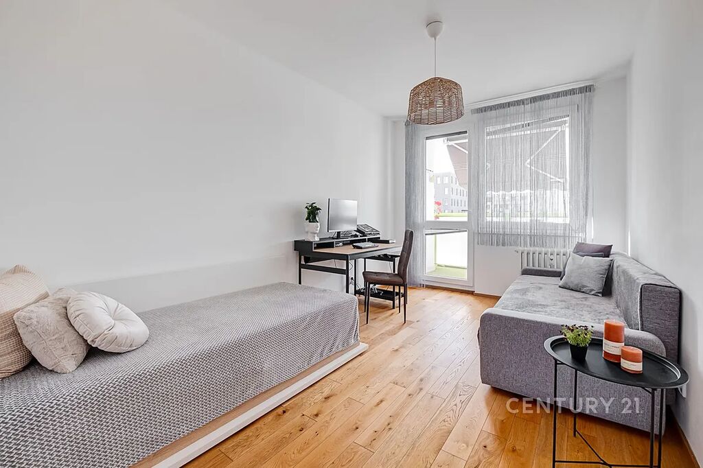 Byt se skládá z prostorného obývacího pokoje, který je díky velkým oknům velmi světlý. Součástí bytu jsou dva další neprůchozí pokoje, které nabízejí dostatek prostoru pro uspořádání ložnice a dětského pokoje nebo pracovny. Nechybí ani malá komora, kde lze mít šatnu. Kuchyň je vybavena moderními spotřebiči. V bytě se nachází koupelna s vanou a WC.