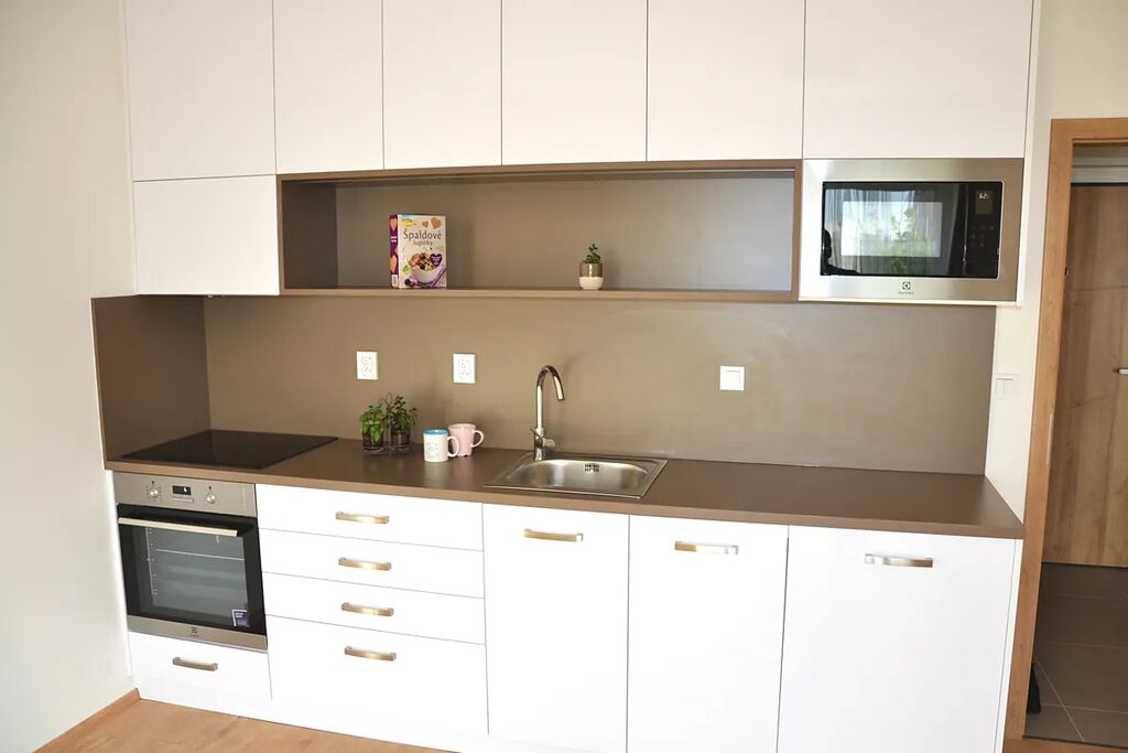 Byt je vybaven kuchyňskou linkou s vestavnou troubou, sklokeramickou varnou deskou, digestoří, chladničkou a mikrovlnnou troubou.