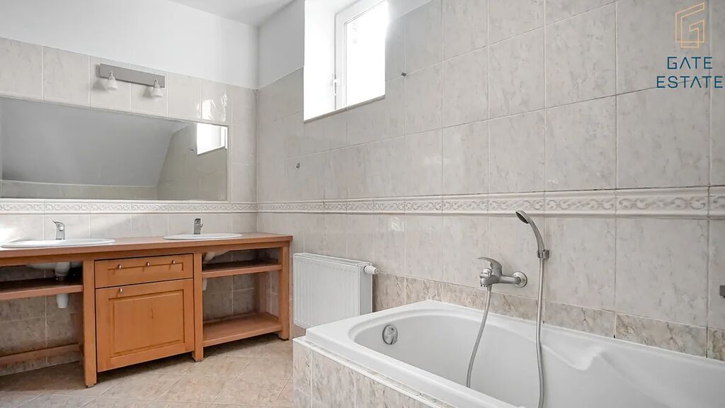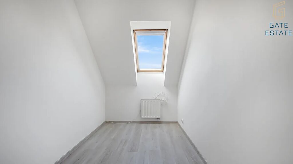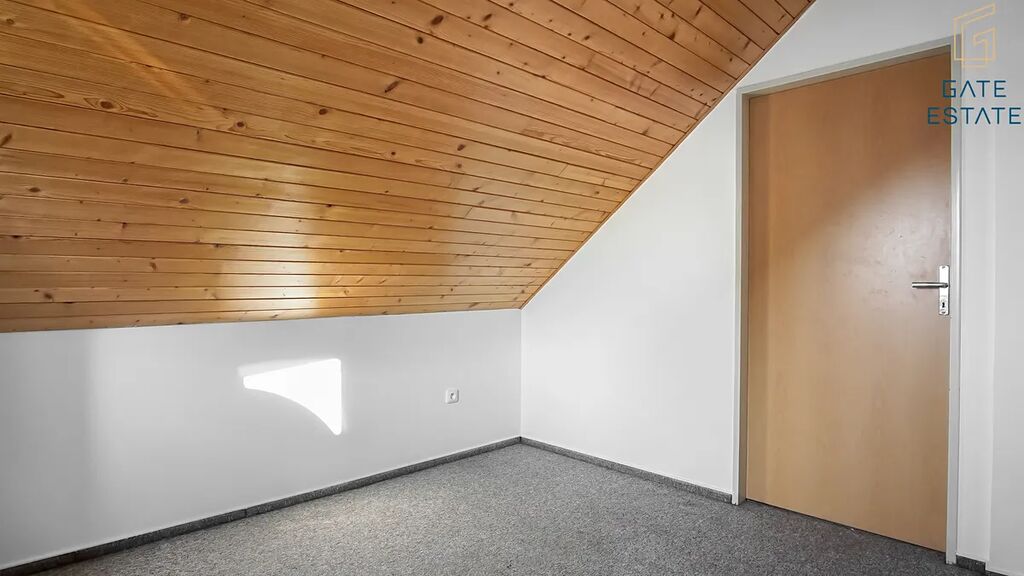 Koupelna působí vzdušně – má dvě umyvadla a vanu, toaleta je samostatně a disponuje vlastním umyvadlem. V patře je klidová část: hlavní ložnice s manželskou postelí a komodami, druhý pokoj je volný k dovybavení dle vašich potřeb (dětský pokoj/pracovna/šatna). Praktické úložné prostory jsou rozmístěny napříč bytem.